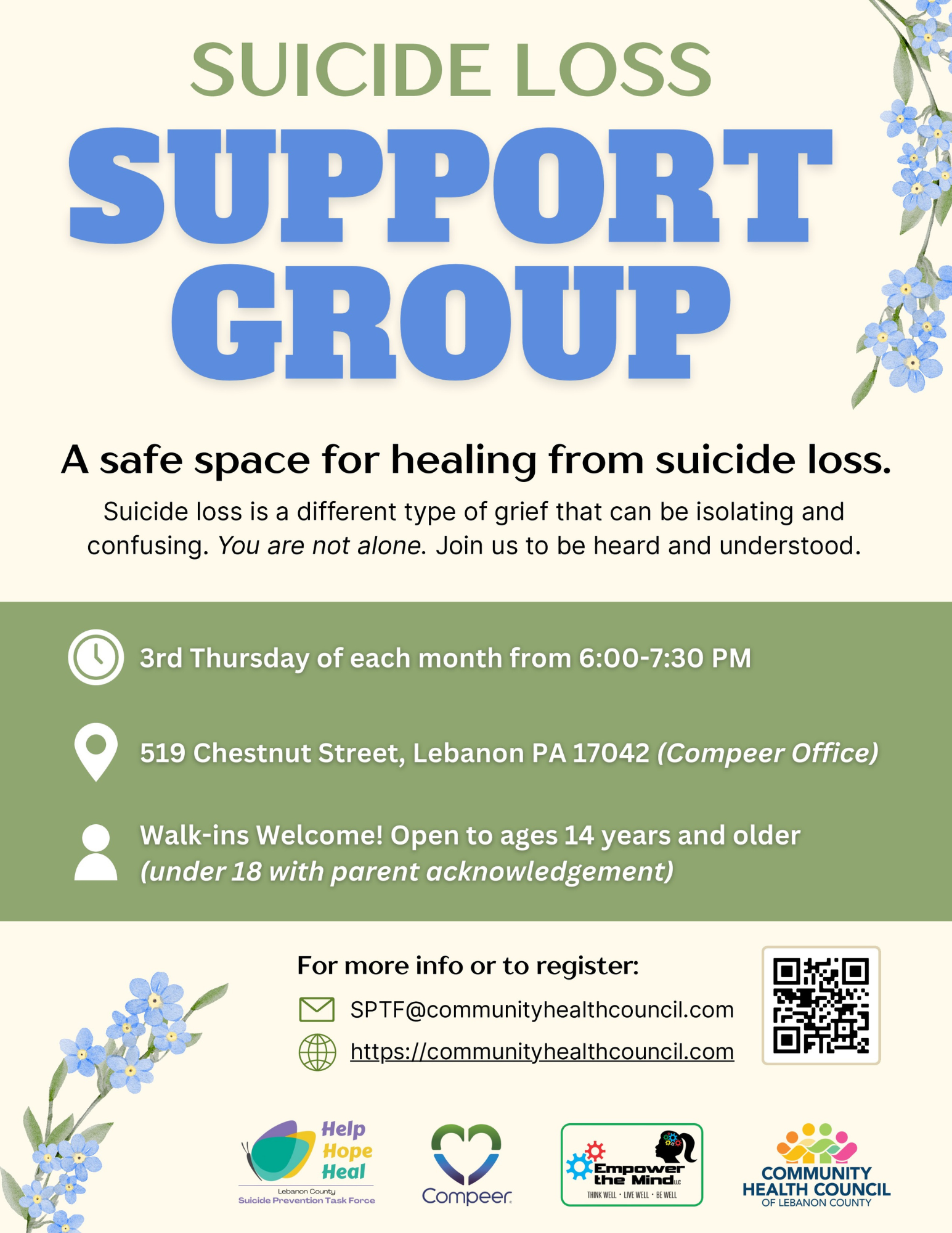 Our Suicide Loss Support Group is currently on pause for the summer. Group meetings will resume on Thursday, September 18th at 519 Chestnut Street, Lebanon (Compeer Office).