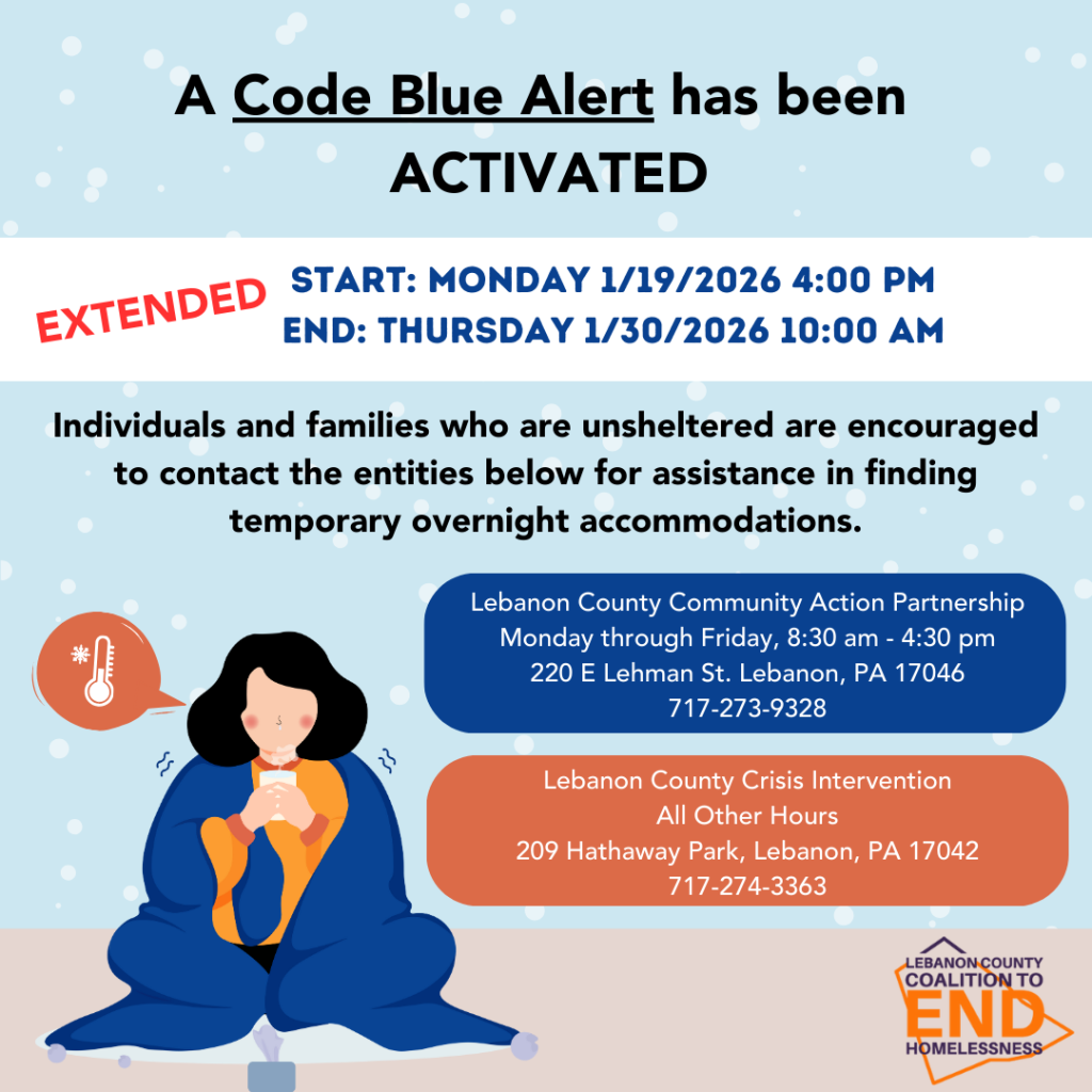 The following Code Blue Announcement is on behalf of the Lebanon County Coalition to End Homelessness: