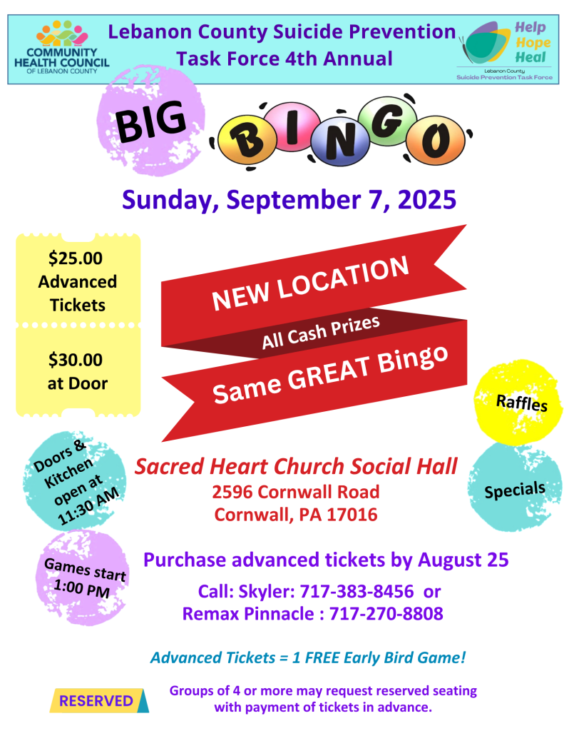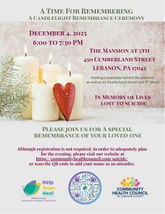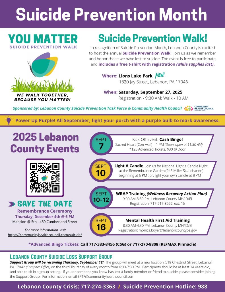 PLEASE JOIN US at any of the Lebanon County events throughout September in recognition of Suicide Prevention month. The month will include trainings and a time of reflection to remember the lives of loved ones and friends we have lost to suicide. We hope you will join us.