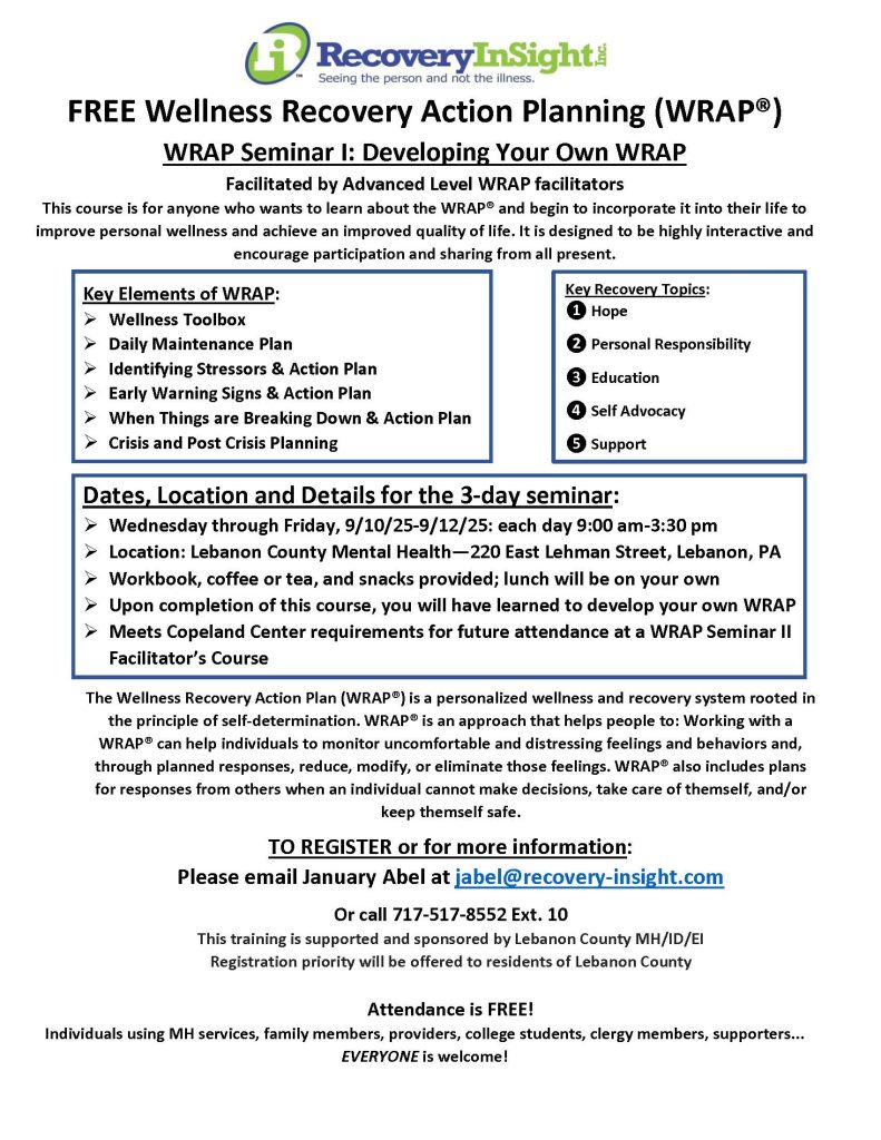 Develop your own plan with the existence of caring certified WRAP facilitators. Lunch Included.