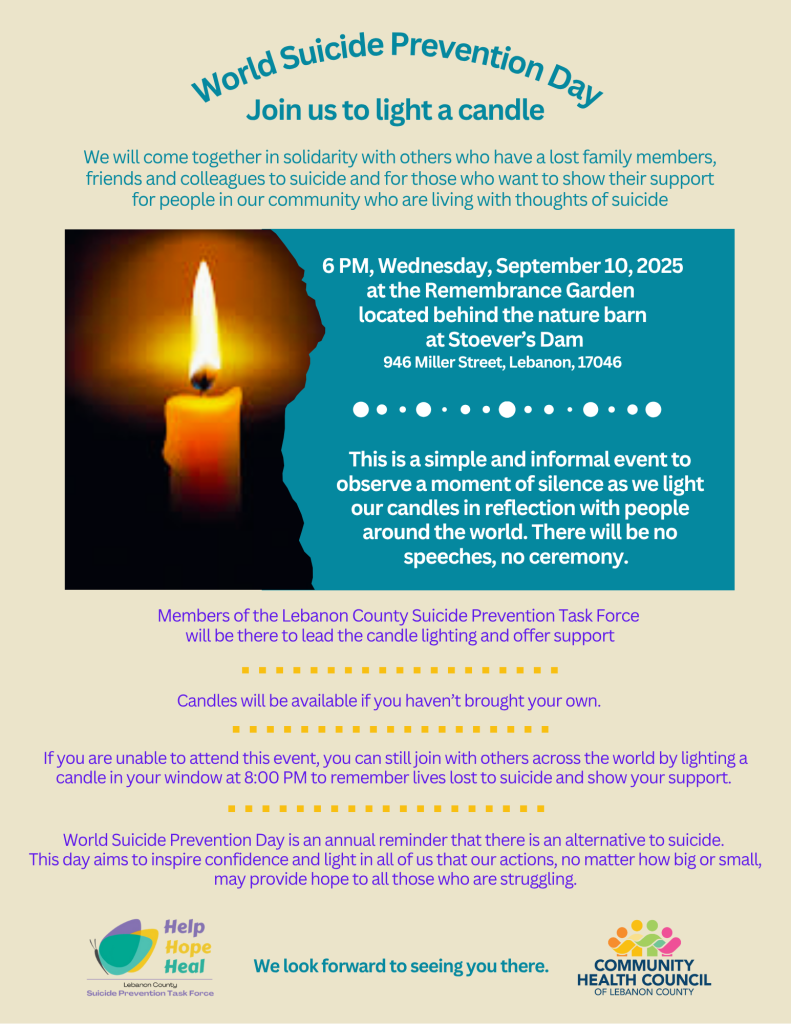 Join us at Stoever’s Dam Remembrance Garden beginning at 6:00pm for a candle lighting; or Light a candle in a window in support of World Suicide Prevention Day.