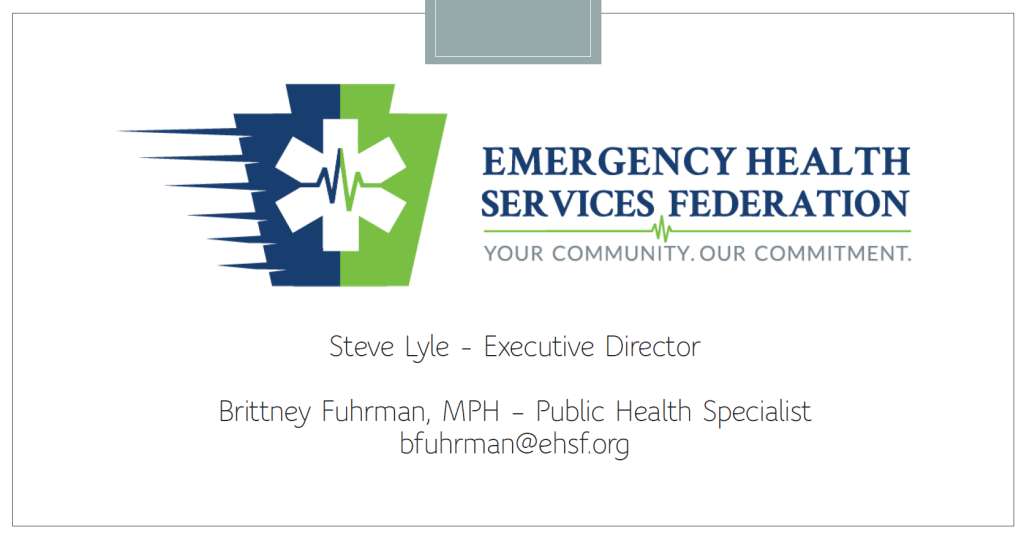 The Emergency Health Services Federation takes pride being a leader for the EMS system. Their goal is to evaluate the system and identify objectives to enhance the quality of EMS throughout the eight counties of South Central Pennsylvania: Adams, Cumberland, Dauphin, Franklin, Lancaster, Lebanon, Perry, and York.